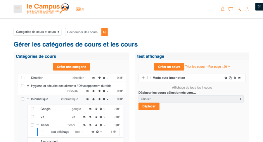 Pour accéder au panneau de gestion des catégories et des cours, deux possibilités :