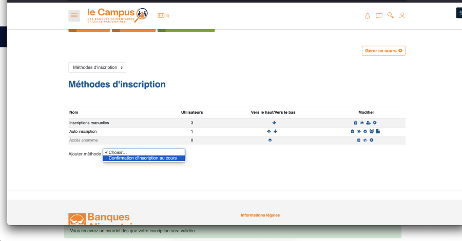 1-Rendez-vous dans la gestion de cours et cliquez sur le lien “Méthodes d'inscription” dans la colonne de droite: