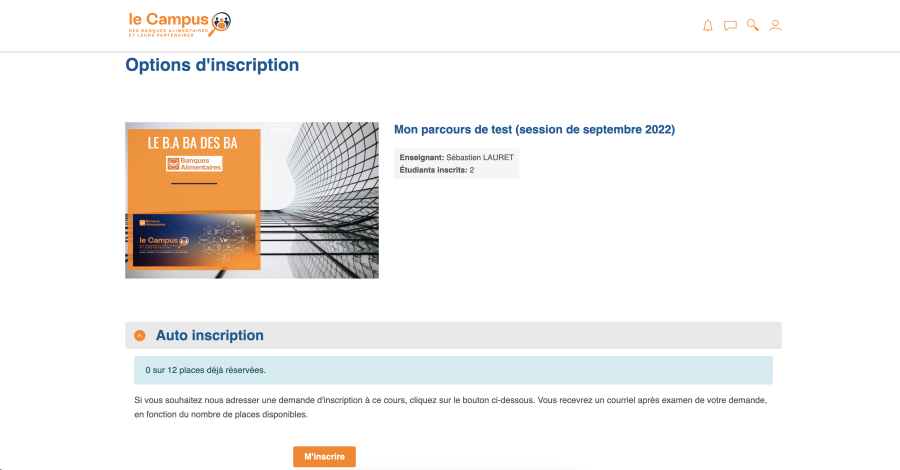 Lorsqu'un parcours propose l'option d'auto-inscription, il s'agit en réalité pour le candidat d'adresser une demande d'inscription à ce parcours. Ceci peut être effectué en cliquant sur le bouton “M'inscrire” comme dans la vue ci-dessous: