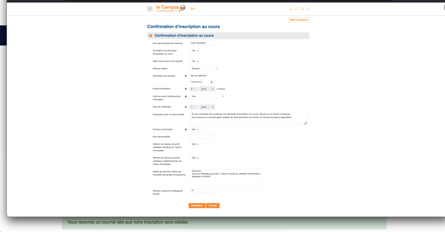 4- Saisissez les informations pour la paramétrage du module d'auto-inscription sur le parcours :
