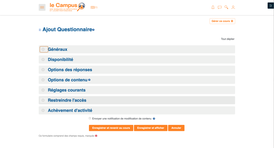 Cette page comporte les sections général, réglages courants et restreindre la disponiblité comme pour toute ressource ou activité.