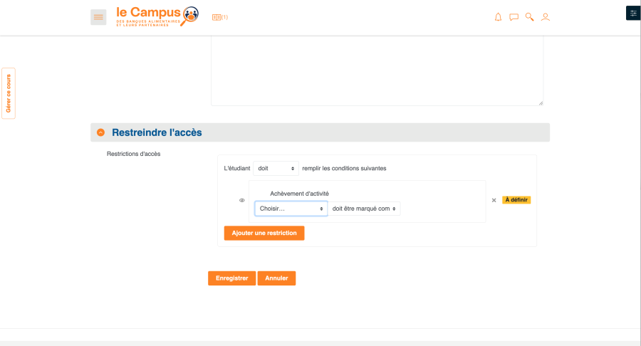 Dans l'image ci-dessus, un exemple de restriction par critère d'achèvement d'activité. Cette dernière peut-être activée/désactivée grâce au bouton en forme d'oeil, et on peut bien sûr la supprimer en cliquant sur le bouton en forme de croix.